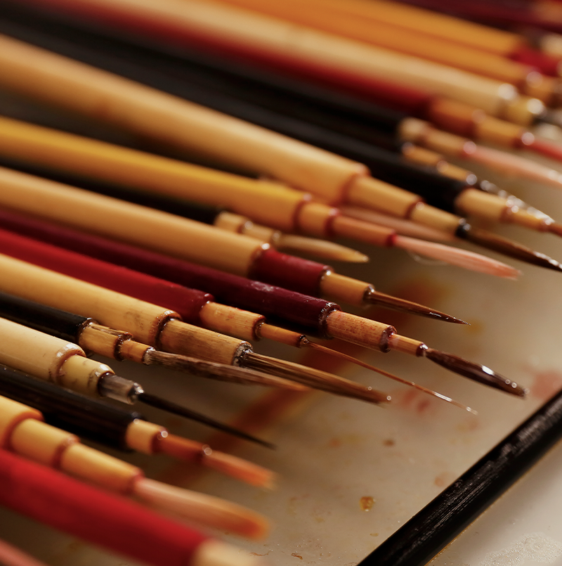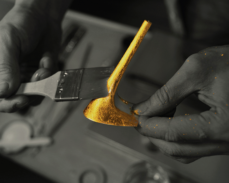 Founder and chief creator, Bertrand Mak moves between sculpture, mixed media, sculpture, and wearable art, united by his signature use of 24-carat gold leaf.