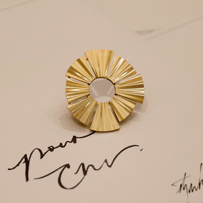 Composed of a variety of gold leaf, silk screen ink, and precious stones atop a convex surface, each Gem is laboriously made via the hands of a collective of master artisans. Created by artist and founder Bertrand Mak, it is a handcrafted jewel as well as transformable object of art that can be crowned onto the house's wearable creations.